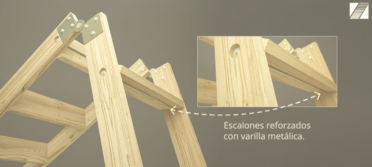 La única del país provista con bisagras que al desplegar la escalera las mismas hacen tope metal contra metal para no generar desgastes en la madera.