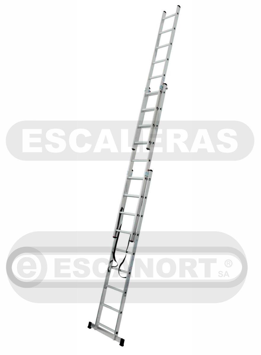 Escalera en tres tramos multifunción, fabrica para una capidad de 113 kg. Posee laterales tubulares de aluminio. Está equipada con dos traba peldaño. Peldaños tubulares con superficie antideslizante remachados directamente a los laterales. Para una adherencia óptima, cuenta con zapatas antideslizantes.