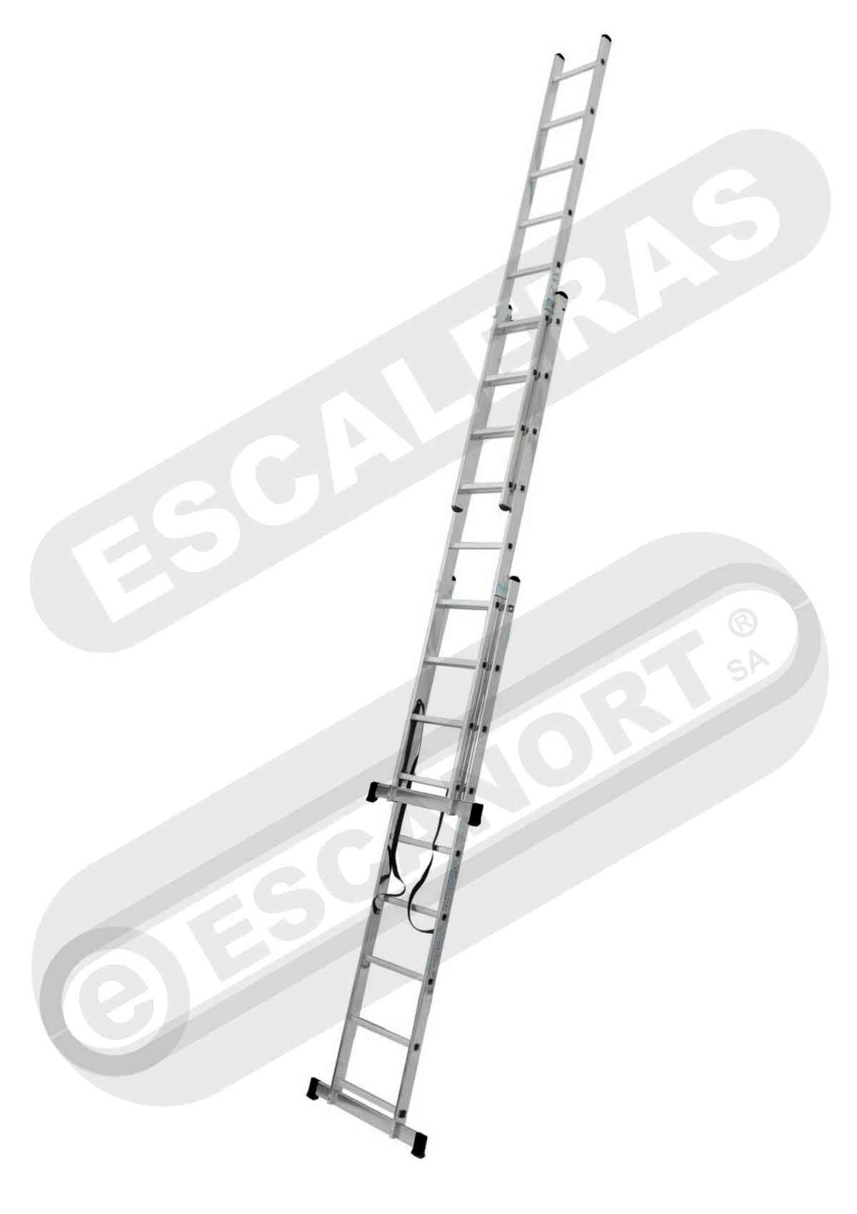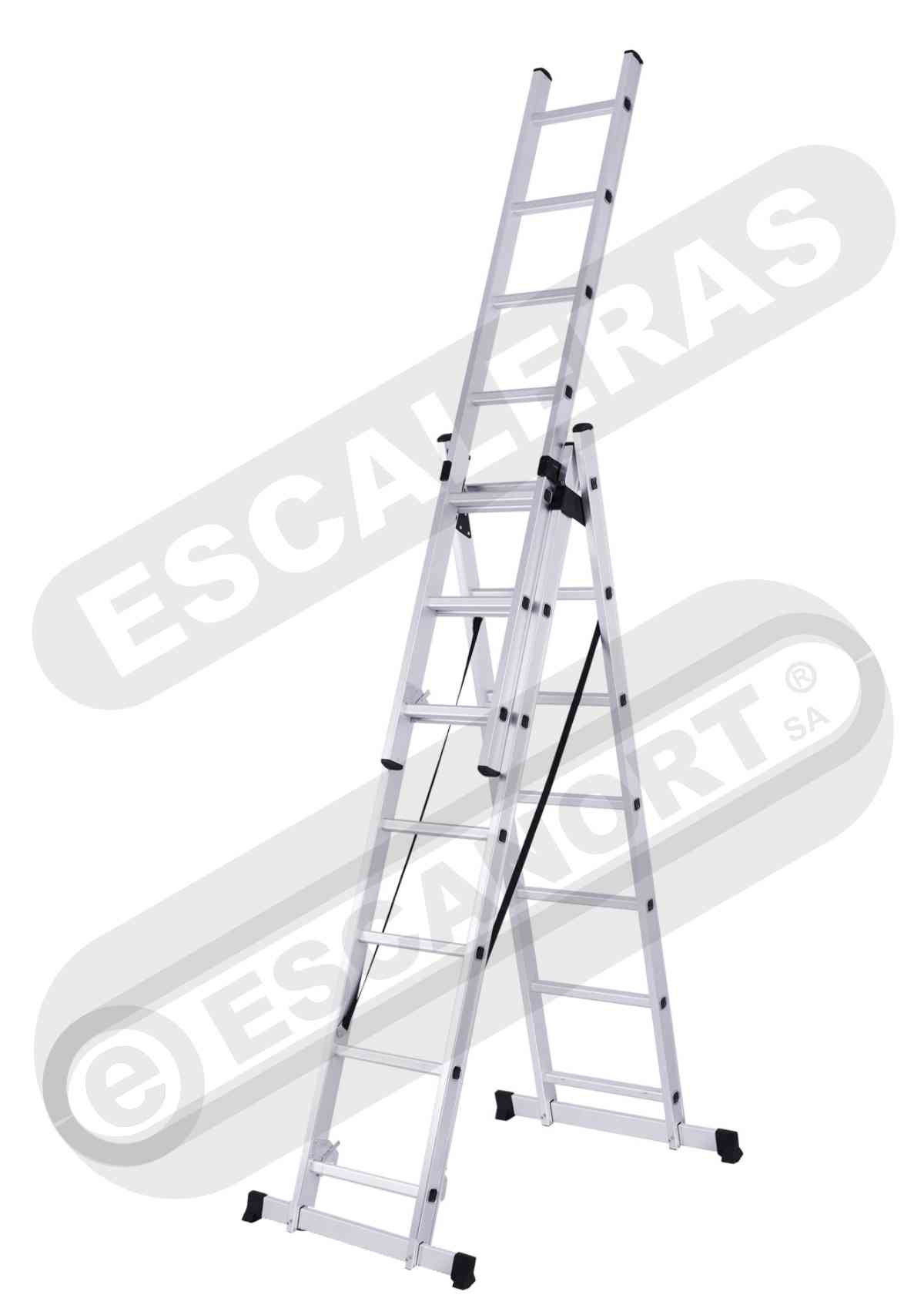 Escalera en tres tramos multifunción, fabrica para una capidad de 136 kg. Posee laterales tubulares de aluminio. Está equipada con cuatro traba peldaño. Peldaños tubulares con superficie antideslizante remachados directamente a los laterales. Para una adherencia óptima, cuenta con zapatas de goma antideslizantes.