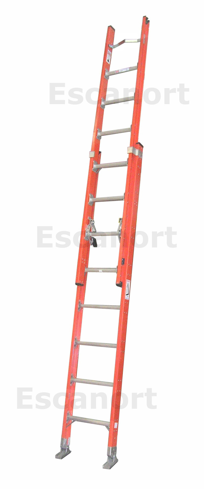 La escalera extensible de fibra modelo pasante está fabrica para una capidad de 136 kg de acuerdo a las normas norteamericanas ANSI. Los laterales de plástico reforzado con fibra de vidrio hacen a la escalera no conductora de electricidad. Está equipada con dos traba peldaño livianas y resistentes. Peldaños planos tipo "D" con superficie antideslizante remachados por medio de una placa a los laterales. Para una adherencia óptima, cuenta con zapatas de doble posición: para superficies duras o blandas. Con elevación a soga desde el modelo de 10 peldaños en adelante. Todas las escaleras incluyen apoya poste.